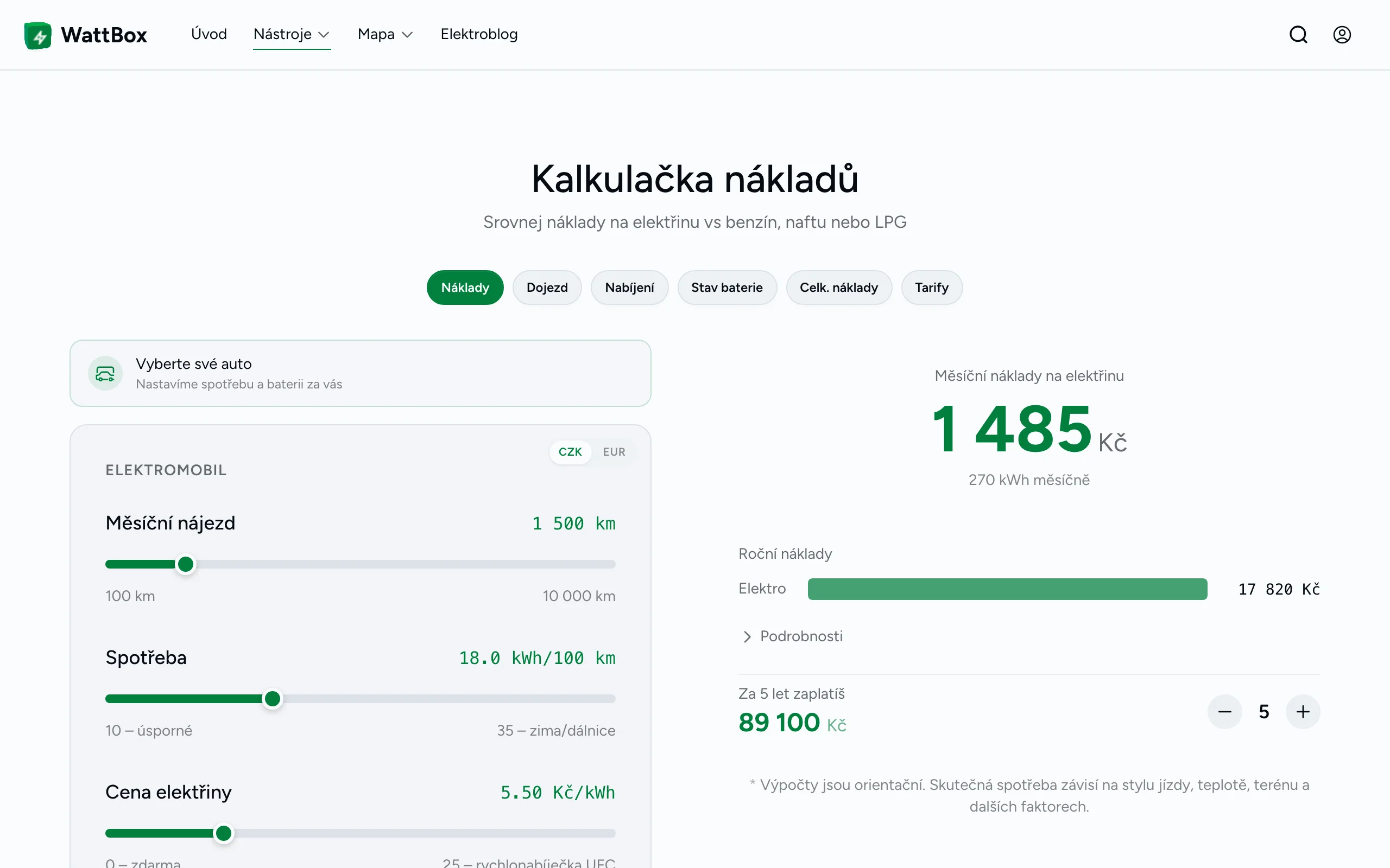 Náklady · Nabíjení · Baterie · Provoz · Nákup